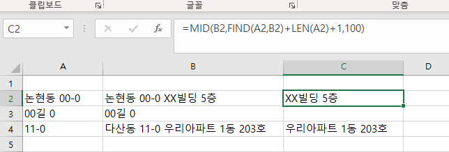 엑셀 주소에서 특정값 뒤에 있는 글씨만 가져오는 방법